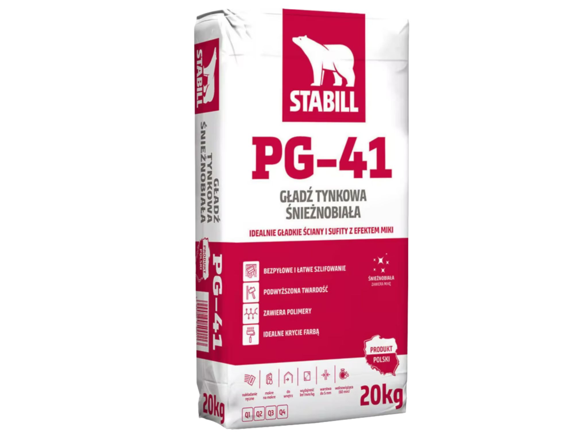 Produkt sprawdzi się zarówno na nowych, jak i remontowanych powierzchniach – tynkach cementowo-wapiennych, gipsowych oraz na płytach gipsowo-kartonowych. Łatwość szlifowania oraz bardzo biały kolor sprawiają, że PG-41 to doskonała baza pod farby i tapety.
