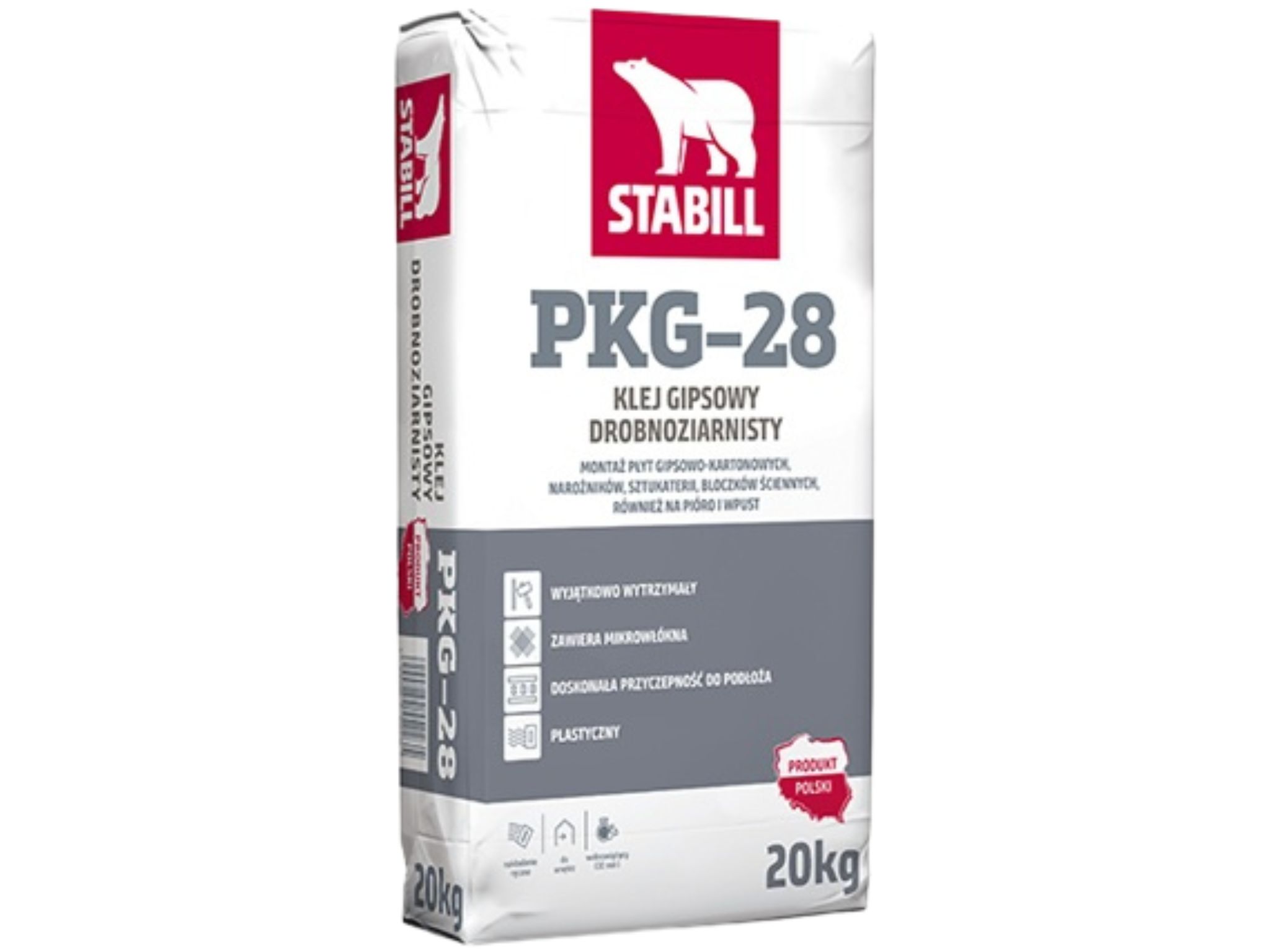 Klej gipsowy STABILL PKG-28 to drobnoziarnista zaprawa przeznaczona do mocowania płyt gipsowo-kartonowych, kasetonów, listew oraz innych elementów dekoracyjnych wewnątrz pomieszczeń. Produkt charakteryzuje się wysoką przyczepnością, łatwością w aplikacji i optymalnym czasem wiązania, co pozwala na komfortową i precyzyjną pracę.